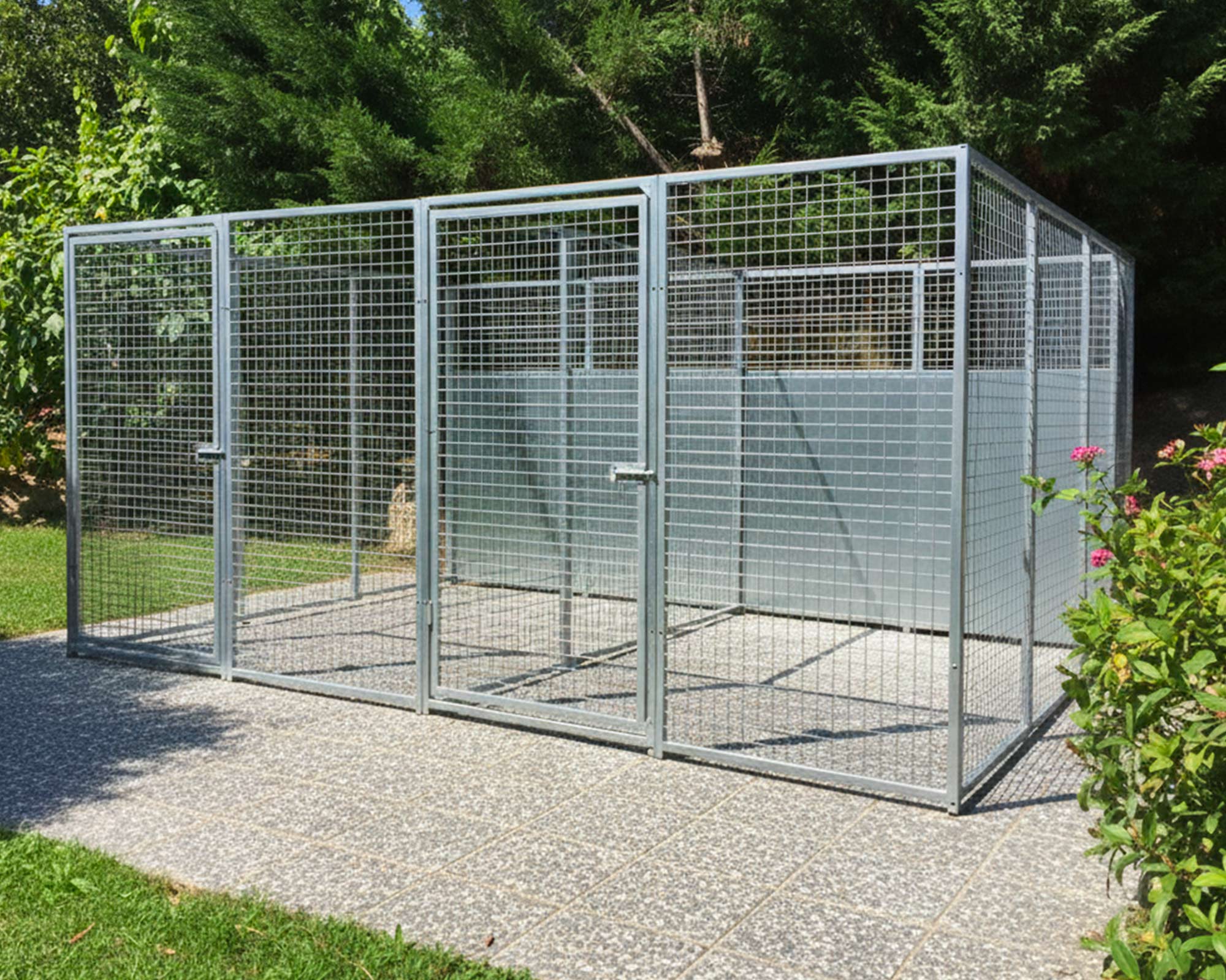 Box per cani doppio. Dimensioni ciascun box 3×2 m, dimensioni totali struttura 4×3 m.