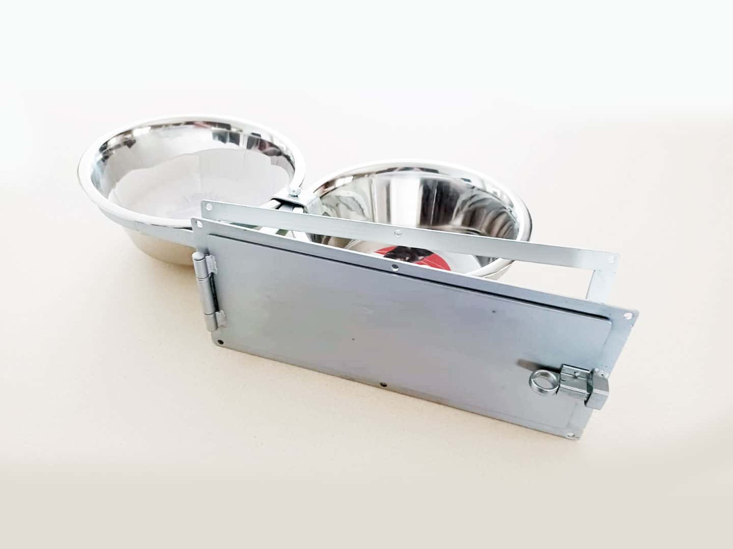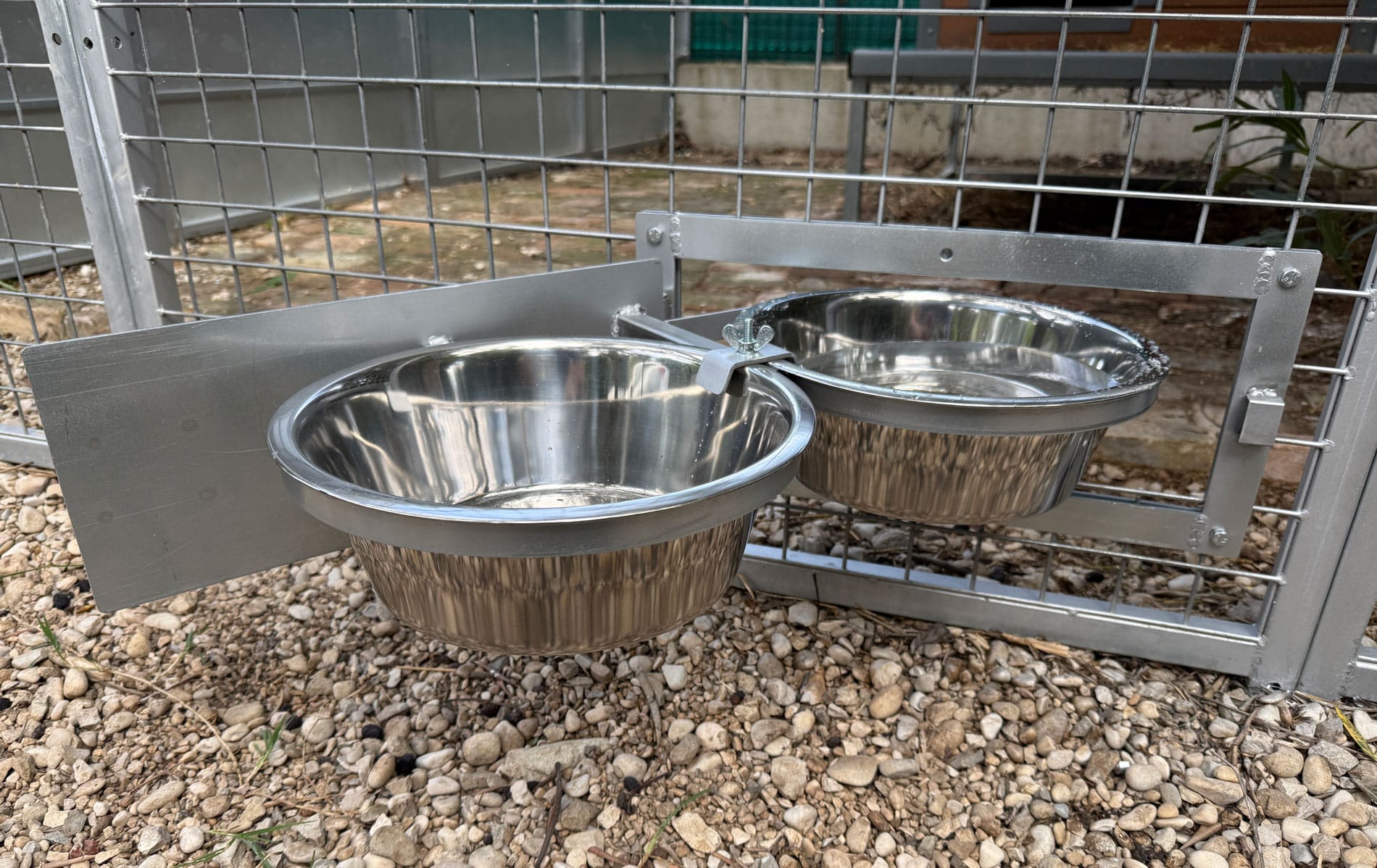 Ciotole girevoli professionali per box e recinti cane. Il giraciotole per cane è composto da una struttura assemblabile su qualsiasi pannello o recinzione, grazie al telaio preforato.