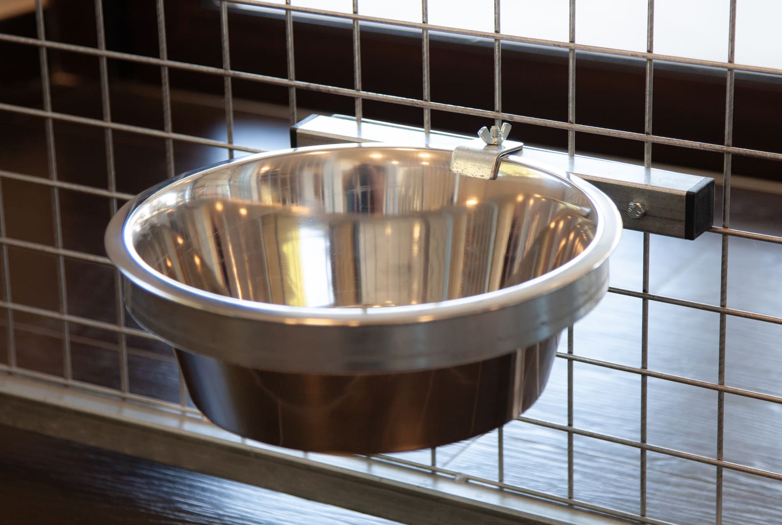 La ciotola inox di grandi dimensioni (25 cm di diametro) è posizionata all’interno di una staffa in acciaio larga 3 cm e spessa ben 3 mm, tenuta bloccata grazie ad un fermo dotato di dado a farfalla, per una rimozione facile e veloce della ciotola.